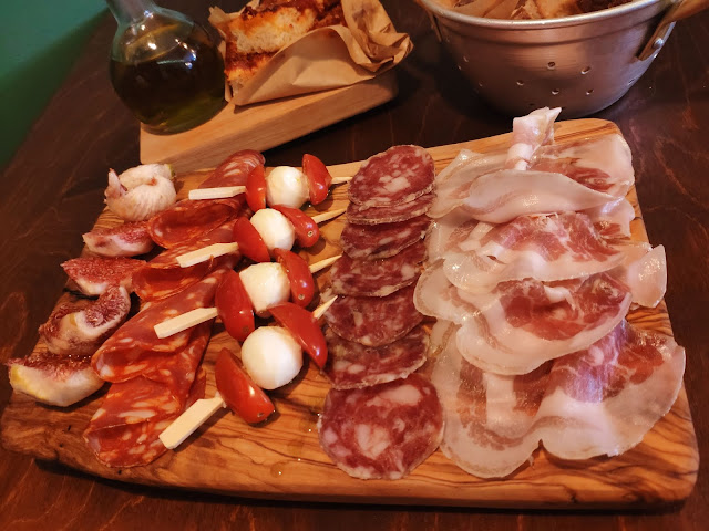 Ξεκινήσαμε το γεύμα μας με αντίπαστι, γεύσεις δροσερές και φινετσάτες, ιδανικές να σε προετοιμάσουν για τα κυρίως πιάτα που θα ακολουθήσουν. Τα σύκα από τη συκιά του Francesco και της Μάγκυ, πεντανόστιμη Focaccia, αλλαντικά και τυριά, όλα αρμονικά συνδυασμένα.